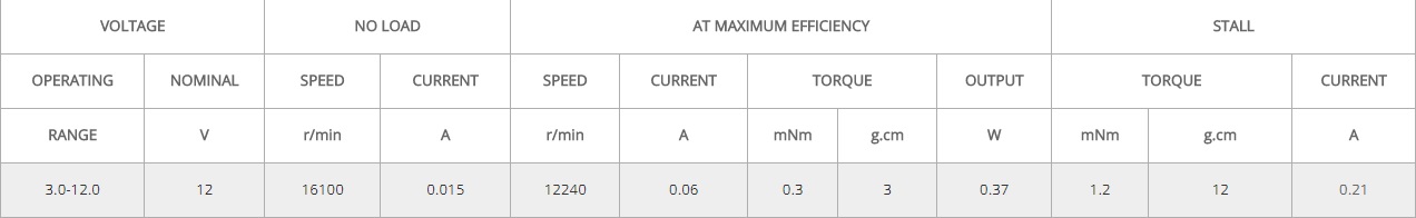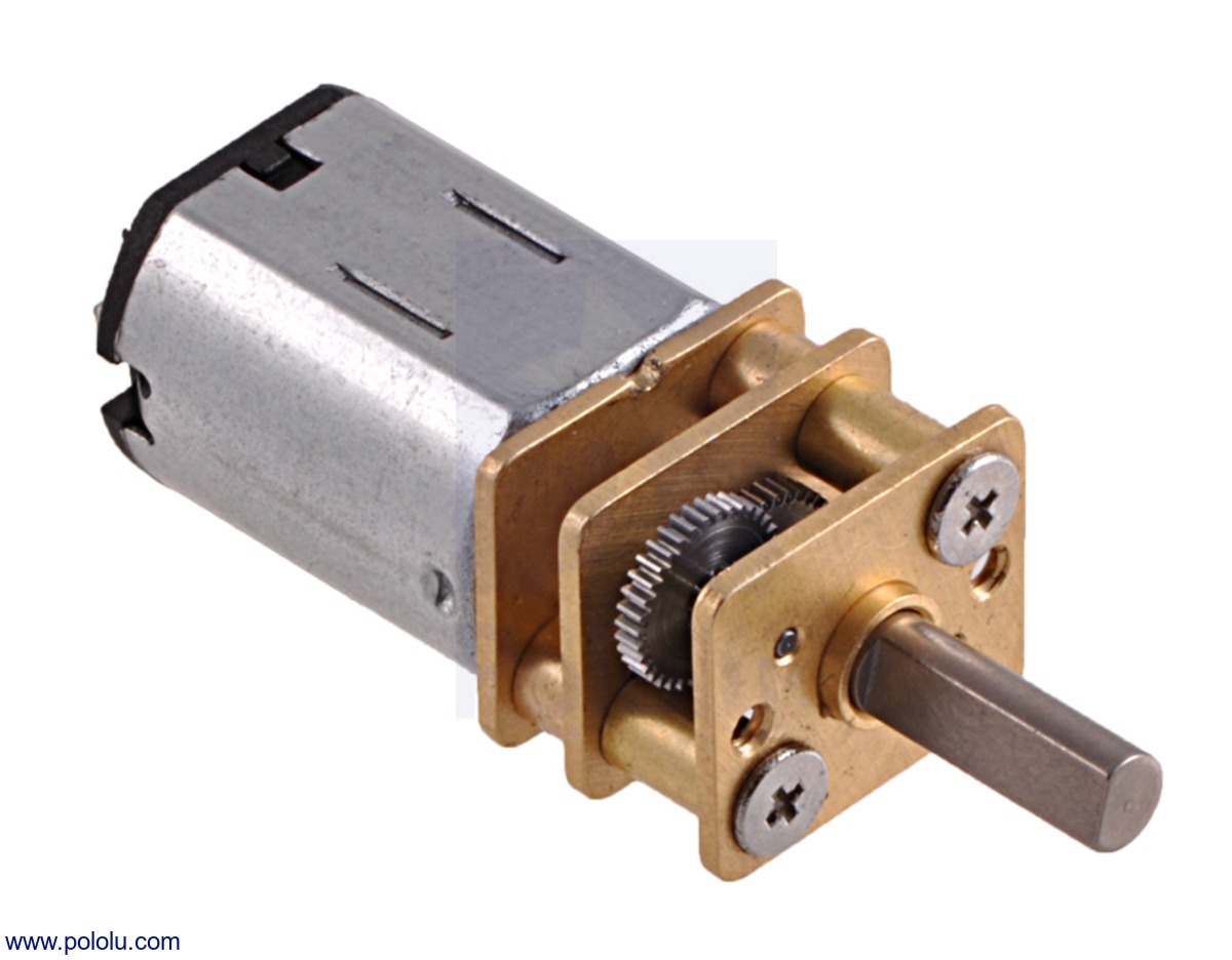 Os motores usados são motores que operam entre os 3V e os 6V com uma velocidade nominal de 12240 rotações por minuto (RPM), devido à taxa de redução da caixa de engrenagens esta velocidade