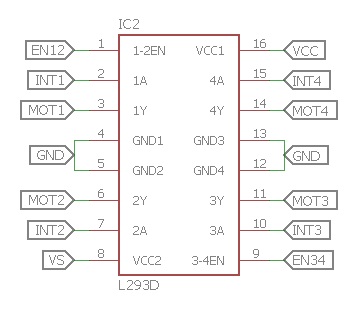 com a label INT controlam o sentido de rotação e a travagem do motor. Este integrado consegue controlar correntes até um máximo de 600mA por motor e com tensões entre os 4.5V e os 36V.