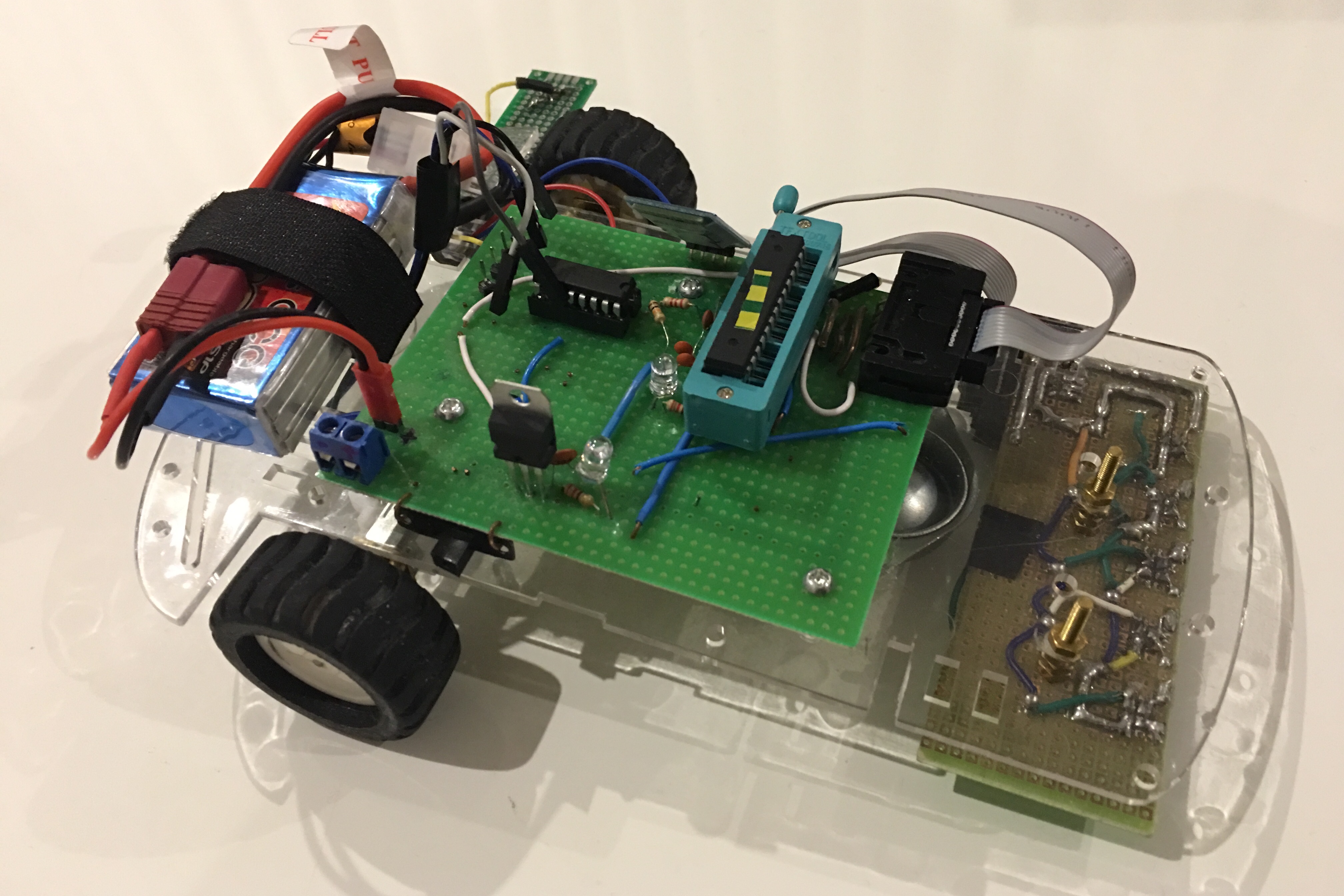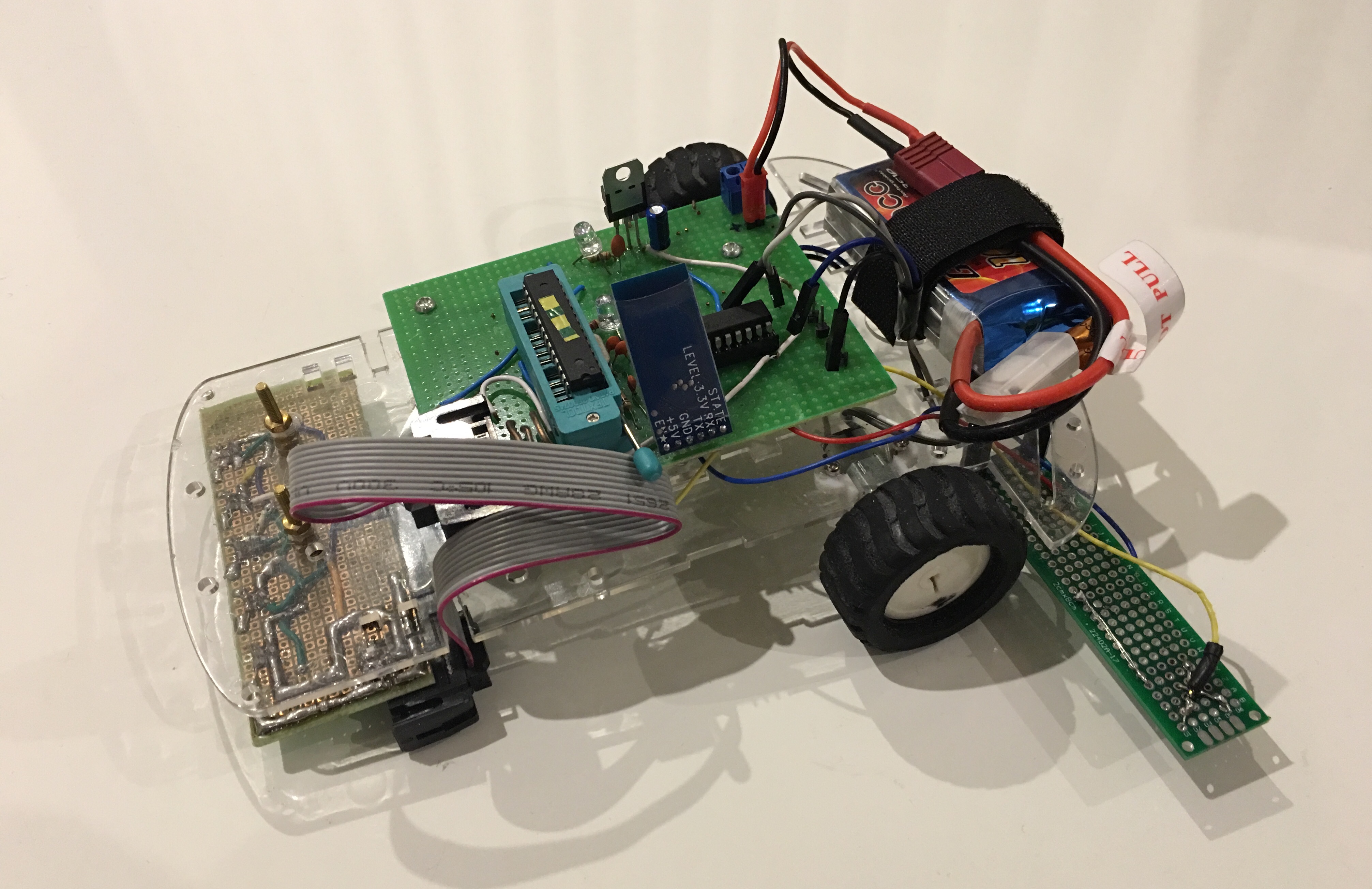 O nosso trabalho baseia-se num veiculo autónomo implementado num microcontrolador (uC) Atmega88 [7] no qual, em primeiro lugar, lê os valores dos sensores de infravermelho (CNY70) [3], de seguida processa-os e no fim actua