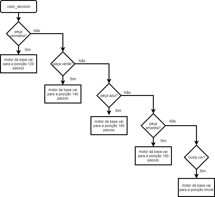 Fig. 27 - Fluxograma da função color_detect A função color_decision() faz o reconhecimento de uma cor das 4 possíveis e desloca o eixo da base para a posição pretendida. Não faz controlo de erro de leitura da cor da peça.