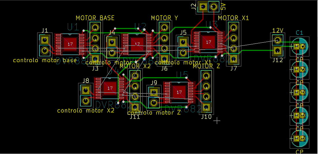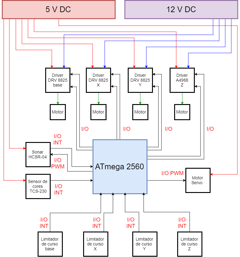 Começando pelos drivers de potência que controlam os motores de passo, estes necessitam de duas alimentações, uma de 5V para comando e outra de 12V - 48V para potência. Outro motor utilizado é um motor servo que é responsável pela abertura e fecho da garra. Este motor é alimentado a 5V e é controlado por um sinal PWM que controla a abertura da garra conforme o valor da largura de impulso.