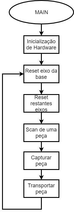 O nosso projeto é programado num modo sequencial sendo que o programa vai avançando efetuando as várias funções sequencialmente. São agora apresentados os vários fluxogramas correspondentes às diferentes funções criadas. O primeiro fluxograma mostra o ciclo principal da função Main.