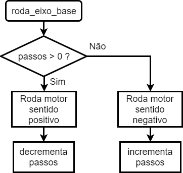 Fig. 18 - Fluxograma da função roda_eixo_base A função roda_eixo_x(int passos) recebe uma variável com o número de passos a serem efetuados pelo motor do eixo X e faz o motor rodar 1 passo na direção pretendida.