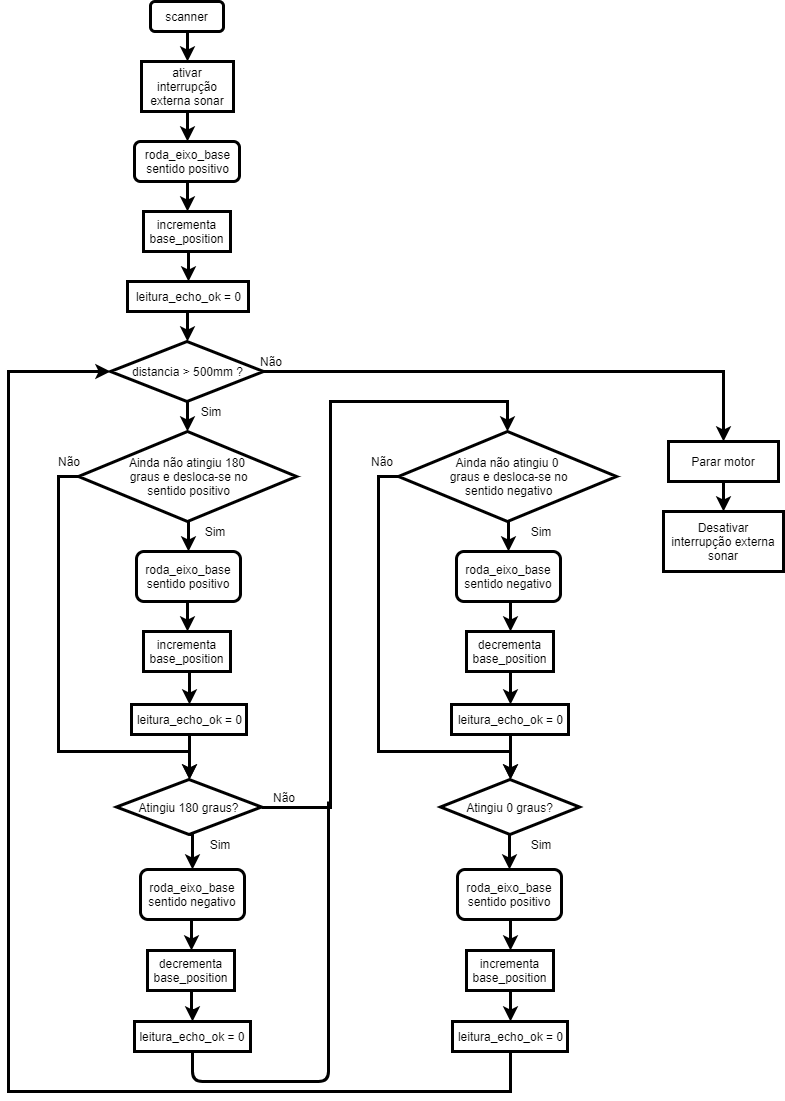 Fig. 23 - Fluxograma da função reset_braco_position A função scanner() ativa o sensor sonar e faz movimentar o eixo da base numa resolução de 180 graus até detetar algum obstáculo a menos de 500 mm. Caso o sonar detete algum obstáculo deve parar o movimento do braço. Se nada for detetado o braço irá movimentar-se até completar 180 graus no sentido positivo e iniciará o movimento no sentido negativo até ser detetado um novo obstáculo.