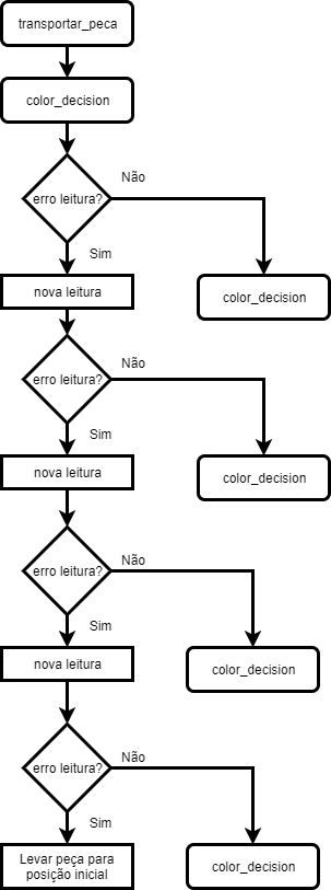 Fig. 28 - Fluxograma da função color_decision A função transportar_peca() desloca a peça para o recipiente de cor correspondente. Se não tiver determinado uma cor das cores possíveis irá voltar a fazer uma nova leitura até um máximo de 5 leituras. Caso não encontre uma solução a peça é encaminhada para a posição inicial.