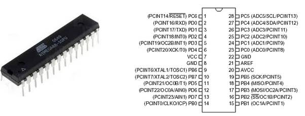 Microcontrolador No que diz respeito ao microcontrolador, utilizámos aquele com que tínhamos elaborado os trabalhos anteriores, já mencionados, ou seja, o Atmega88 PDIP da Atmel, uma vez que este tem todas as capacidades de que precisamos para a elaboração deste projeto. No nosso caso vamos precisar de quatro entradas ADC (Analog Digital Converter), uma interrupção externa (INT0), dois timer´s, um para gerar uma temporização de 2,5ms, e outro de maneira a gerarmos duas saídas de PWM para poder fazer o controlo dos motores através das pontes H.