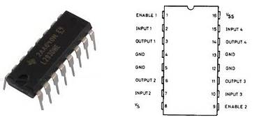 Pontes H Devido à necessidade de incluir entre a saída logica do microcontrolador e a entrada dos motores um sistema responsável pela parte de potência, optamos, para a resolução desse problema, pela utilização do L293DNE da Texas Instruments. A gama de valores de alimentação varia entre 4,5 e 36V produzindo para esta tensão uma corrente na saída de 600 mA. Este componente tem como aspeto importante o facto de possuir duas entrada de alimentação, uma para a comparação dos níveis lógicos das entradas e outra para o valor de tensão de saída, também possui quatro saídas, o que permite controlar a velocidade e sentido de dois motores através da variação do pwm (pulse-width modulation) no enable que permite a ativação de cada um dos canais de saída. A alimentação das baterias em conjugação com a queda de tensão no circuito interno deste componente, permite obter a tensão desejada para o controle dos motores.