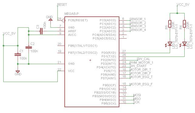 do microcontrolador No que diz respeito a este bloco podemos verificar que, entre os pinos VCC e GND existe um condensador de 100nF, este componente é aconselhado para eventuais oscilações ou ruído existentes, pode-se encontrar um outro condensador de igual valor entre os pinos AREF e AVCC, este devido à configuração do ADMUX, uma vez que, ao configurar este registo estamos a utilizar a tensão de referência AVCC e no ‘datasheet’ do microcontrolador é descrito a inserção de um condensador entre estes dois pinos. Por último o condensador entre AVCC e GND é colocado no circuito pelos mesmos motivos descritos no condensador entre VCC e GND. Nos portos PD0 e PD1, existem dois Leds com a respetiva resistência de proteção de corrente. Estes dois Leds dizem respeito ao Led pisca, com oscilação a uma frequência de 1Hz, conforme enunciado anteriormente, o outro corresponde ao Led de calibração que é ativo durante a calibração dos quatro sensores. Nos portos PC0, PC1, PC2 e PC3 temos os sensores de linha e que correspondem aos conversores analógico-digitais que servem para ler os valores dos mesmos em valor analógico convertendo-os para um valor digital passível de ser trabalhado por software. Nos portos PD2 e PD4 temos os ‘switches’ de calibração e ‘start’ respetivamente, que tal como o nome sugere, refere-se a calibração dos sensores e ao seu inicio de funcionamento Os portos PD3, PB3, PD5, PD6, PD7 e PB0, representam o controlo dos motores ligados ao circuito da ponte H, representado na figura 16. Os portos PB3, PB4, PB5 e PC6 representam o conetor de seis pinos para a programação do microcontrolador, representado na figura 20.