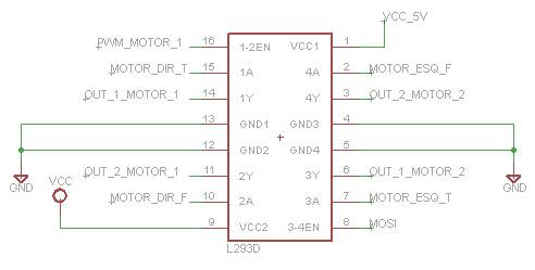 da ponte H Como já referimos no capítulo anterior, este componente possui duas entradas de alimentação, sendo alimentado diretamente o pino representado por VCC2 pelas baterias (7.5V) e o pino VCC1 pelos 5V para comparação logica das entradas. Os pinos 1A, 2A, 3A e 4A são de entrada lógica e servem para receber o valor da saída do microcontrolador, os dois primeiros referem-se ao estado que iremos pretender referente ao motor do lado direito e os seguintes ao motor do lado esquerdo. Os pinos 1Y, 2Y, 3Y e 4Y, são os pinos das saídas e representam o estado de cada um dos pinos referidos no parágrafo anterior, sendo que o seu valor em tensão é obtido através do valor da alimentação do pino VCC2. Os pinos 1Y e 2Y são as entradas do motor do lado direito e os restantes as entradas do motor do lado esquerdo. O ‘enable’ de cada um dos lados distintos de funcionamento é efetuado através dos pinos 1-2EN e 3-4EN, sendo o primeiro responsável pelo motor do lado direito e o segundo pelo motor do lado esquerdo. Como estes pinos podem colocar ou retirar as respetivas saídas de funcionamento utilizamos a saída de pwm (OC2A e OC2B) do microcontrolador para alimentar estes dois pinos, uma vez que assim conseguimos alterar a velocidade dos motores alternando o valor lógico destas entradas. Os restantes pinos ainda não referidos são pinos de massa do componente.
