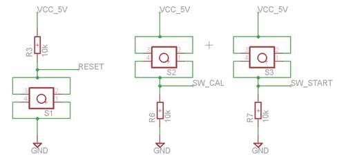 Figura 18 – Circuito regulador de tensão(DC-DC) 4. Circuito botões Neste ponto é exemplificado o esquema elétrico dos ‘swicthes’ de ‘reset’, calibração e de ‘start’. Estes pinos estão ligados ao microcontrolador nos portos PC6, PD2 e PD4 respetivamente.