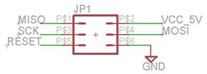 do conetor de programação Em seguida é demonstrado o conetor de programação para o microcontrolador. Os pinos com o nome MISO (PB4), SCK (PB5), RESET (PC6) e MOSI (PB3) são os pinos de calibração do microcontrolador sendo que o de VCC e GND servem para retificar se a alimentação a este está correta.