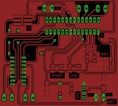 Figura 21 – Circuito dos sensores PCB Após a construção de todo o esquema elétrico, procedeu-se à sua conversão para layout. Dispusemos todos os componentes da forma mais adequada e efetuamos todas as ligações, obtendo uma PCB com a aspeto da figura 22. O esquema elétrico dos sensores foi convertido também noutra PCB, deste modo ficamos com uma placa com o aspeto da figura 23.