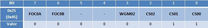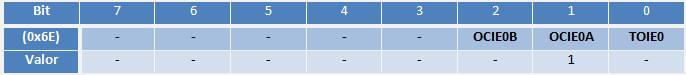 No TCCR0A os bits 7,6,5 e 4 definimos com o valor 0 para trabalharmos em ‘Normal port operation’, ou seja, ‘OC0A disconnected’ e ‘OC0B disconnected’. Para trabalhar no modo 2, ou seja, em modo CTC tem que se colocar em WGM02, WGM01 e WGM00 os bits 010 respetivamente. Para funcionar com o clkIO/64 para o prescaler os valores são CS02=0, CS01=1 e CS00=1. TIMSK0 - Timer/counter interrupt mask