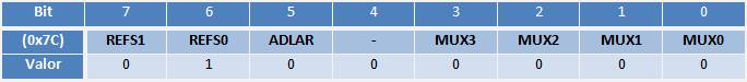 Ao colocar o OCIE0A com o valor 1 estamos a fazer o ‘enable’ para permitir a interrupção por comparação. Como só precisamos de uma interrupção só nos interessa fazer o ‘enable’ a uma saída de interrupção por comparação. ADMUX