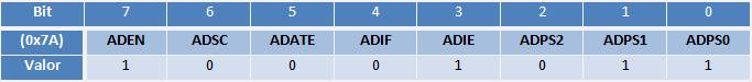Os bits 7 e 6 são colocados a 0 e a 1 respetivamente para ativar como tensão de referência a tensão AVcc. O bit do ADLAR é colocado a 0 pois iremos trabalhar com os dez bits de conversão. Ao colocar os quatro bits menos significativos todos a zero estamos a definir a ADC0 como canal de entrada. (Este valor é alterado no decorrer do programa para selecionar outros pinos de conversão). ADCSRA- ADC control and status register A Tabela 4 – Preenchimento do ADCSRA