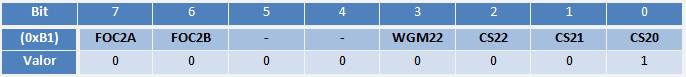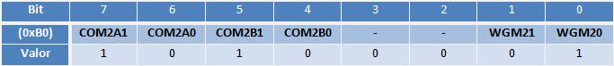 No TCCR2A os bits 7 e 5 colocamos a 1 e os bits 6 e 4 definimos com o valor 0 para trabalharmos em ‘Clear OC2A on compare match’ para a saída A e para a saída B. Para trabalhar no modo 1, ou seja, em modo PWM, phase correct tem que se colocar em WGM22, WGM21 e WGM20 os bits 001 respetivamente. Para trabalhar sem prescaler os valores são CS22=0, CS21=0 e CS20=1. EICRA – External