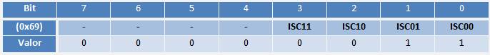 Com estes dois bits a 1 (ISC01 e ISC00) estamos a definir a interrupção no flanco ascendente. EIMSK- External Interrupt Mask Register Tabela 8 – Preenchimento do EICRA