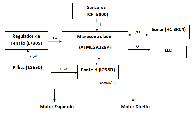 Na arquitetura do nosso projeto temos, como base principal, o microcontrolador Atmega328P, pois todas as medidas e as ações a serem executadas “passam” por ele. O circuito é alimentado através de 2 pilhas, com um valor de tensão de 7,6 Volts, que estão a alimentar diretamente a ponte H, e para a alimentação do resto do circuito, foi utilizada um regulador de tensão l7805, para obter uma tensão de 5 Volts. O programa lê o valor de cada um dos sensores, e a distância medida pelo sonar e, a partir destes valores, vai ajustar o valor de PWM enviado para o L298N. Na figura abaixo está representado o diagrama de blocos do sistema.