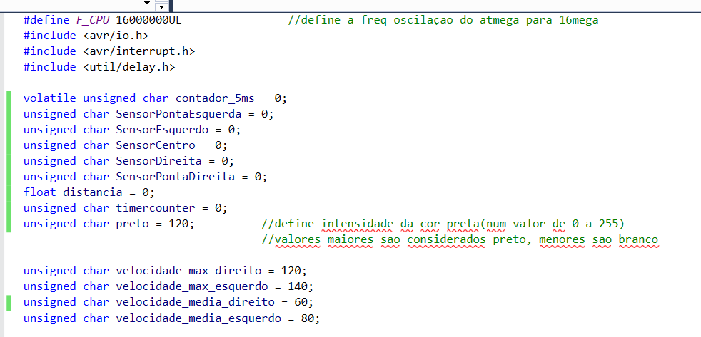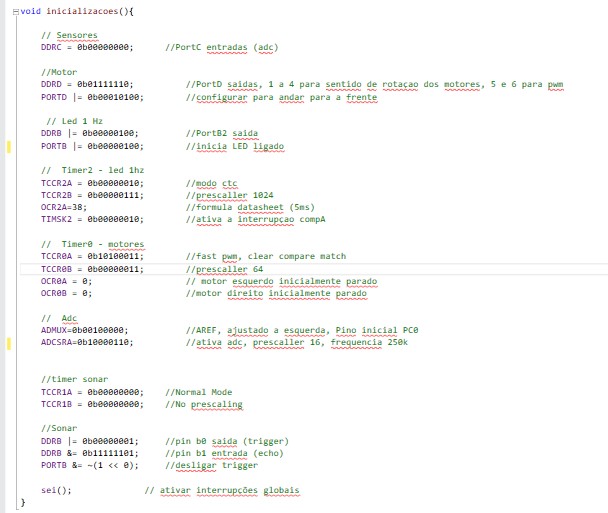 Figura 11: Código biblioteca e variáveis Aqui são incluidas as bibliotecas necessárias ao funcionamento do programa, e definidas as variáveis a ser utilizadas ao longo do código, tal como valores de medidas de sensores e valores de PWM predefinidos. Inicializacoes()