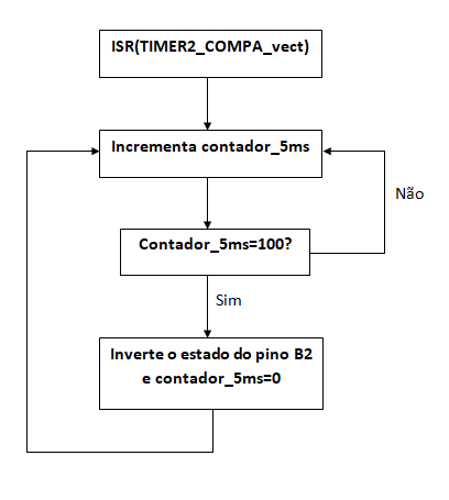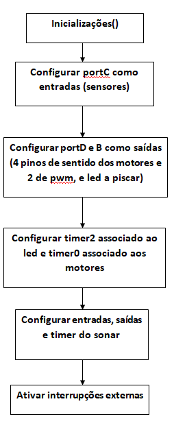 Figura 13: Fluxograma Inicializações Antes do programa entrar no ciclo infinito, é chamada a função inicializações, onde foi configurado o porto C como entradas para as medições dos 5 sensores. Foi utilizado este porto pois tem capacidade de realizar conversões de sinal analógico, em tensão, para digital, valores que podem variar de 0 a 255 (8 bits). Também é configurado o Porto D para saídas dos 4 pinos de controlo do sentido dos motores, e para os 2 pinos com capacidade de gerar PWM (PD5 e PD6). O pino PB2 está ligado ao led que pisca a 1 Hz. De seguida é configurado o timer0 associado ao led para este piscar a 1 Hz, e o timer2, associado aos sinais PWM responsáveis pelas ligações dos motores DC Por fim, é configurado a conversão analógico para digital, e ativada as interrupções globais. ISR(TIMER2_COMPA_vect)