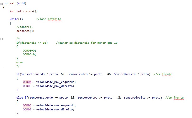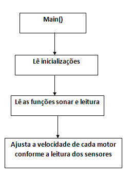Figura 21: Fluxograma Main Main Na função principal, são chamadas as funções leitura e sonar, e, de acordo com os valores obtidos nestas funções, ajusta o tamanho do pulso PWM. No caso da distância medida pelo sonar for inferior a 20 centímetros, o veículo para, se for maior, continua o seu percurso. Depois de obtidos os valores dos sensores convertidos para digital, verificamos o valor de cada um, podendo variar de 0 a 255, em que valores maiores que 120 são considerados preto.