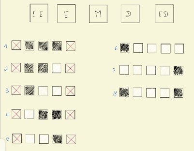 Figura 22: Estados de leitura dos sensores Os 2 sensores das pontas foram implementados para detetar curvas mais acentuadas que poderiam não ser detetáveis apenas com os 3 sensores. Estes sensores só afetam o PWM no caso de os 3 sensores do meio detetarem branco (menor que 120). Nestes casos, se um dos sensores dos extremos detetar linha, é ajustado para retornar à linha. Se for detetado linha em ambos os sensores das extremidades, ele desliga o PWM. Os 3 sensores do meio são os principais, ajustando o PWM dos motores conforme os valores obtidos na função leitura. Por exemplo, no caso 2 da figura x, é aplicado ao motor do lado direito um valor de PWM maior, para assim corrigir a linha suavemente. Se, por exemplo, no caso 3 da figura x, significa que a curva é mais acentuada, e assim é desligado o motor da esquerda e atribuído o valor máximo de PWM ao motor da direita. Esquema elétrico