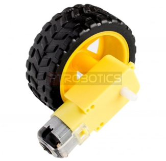 Figura 4: ATmega328P Motores DC e rodasForam utilizados 2 motores DC, um associado a cada roda, para conseguir controlar independentemente a velocidade das rodas através de sinal PWM gerado pelo microcontrolador. Se estiver aplicado uma queda de tensão maior numa das rodas, vai fazer com que esta rode mais depressa em relação à outra roda, e assim o veículo consegue realizar curvas.