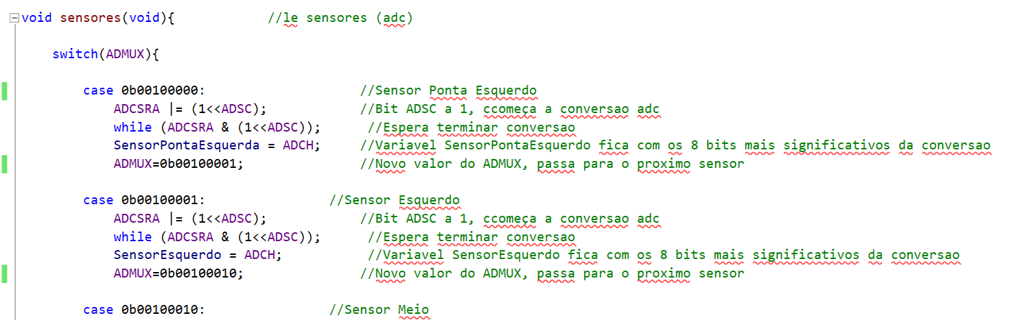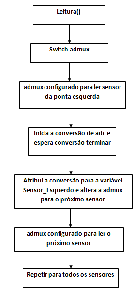 Figura 17: Fluxogramas Sensores Nesta função é realizada a leitura dos valores obtidos pelos sensores. Começamos pelo valor obtido no pino PC0, em que é colocado a 1 o bit ADSC, inicializando assim a conversão ADC (analógico para digital). Depois de terminada, o valor dos 8 bits mais significativos da conversão é guardado numa variável, e de seguida é ajustado o valor de admux, variando os bits fazendo corresponder à entrada do próximo sensor. Este código é aplicado para cada um dos sensores. Sonar()