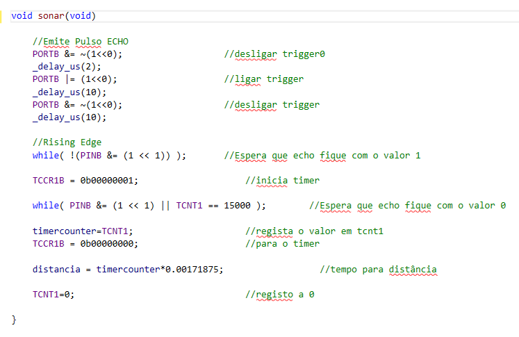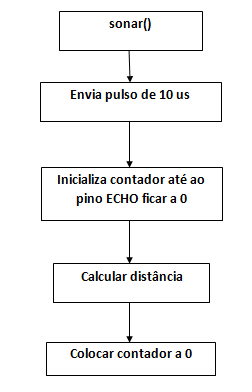 Figura 19: Fluxograma Sonar Quando a função fluxograma é chamada, esta vai emitir um sinal de 10 microssegundos no pino do trigger, e posteriormente irá inicializar a contagem no temporizador até o pino do echo ficar a 0, e assim o programa através do registo TCNT1 e a constante da velocidade do som, irá calcular a distancia medida pelo sonar. Main()